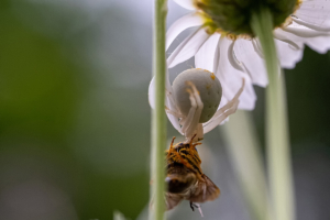 In einem Garten im Hagener Süden (NRW) beobachtete und fotografierte ich eine Szene, bei der eine ca. 10 Millimeter große Spinne eine Biene auf eine Margerite hievte. Wie ist das möglich, dass eine so kleine Spinne ein deutlich größeres Tier fangen kann?